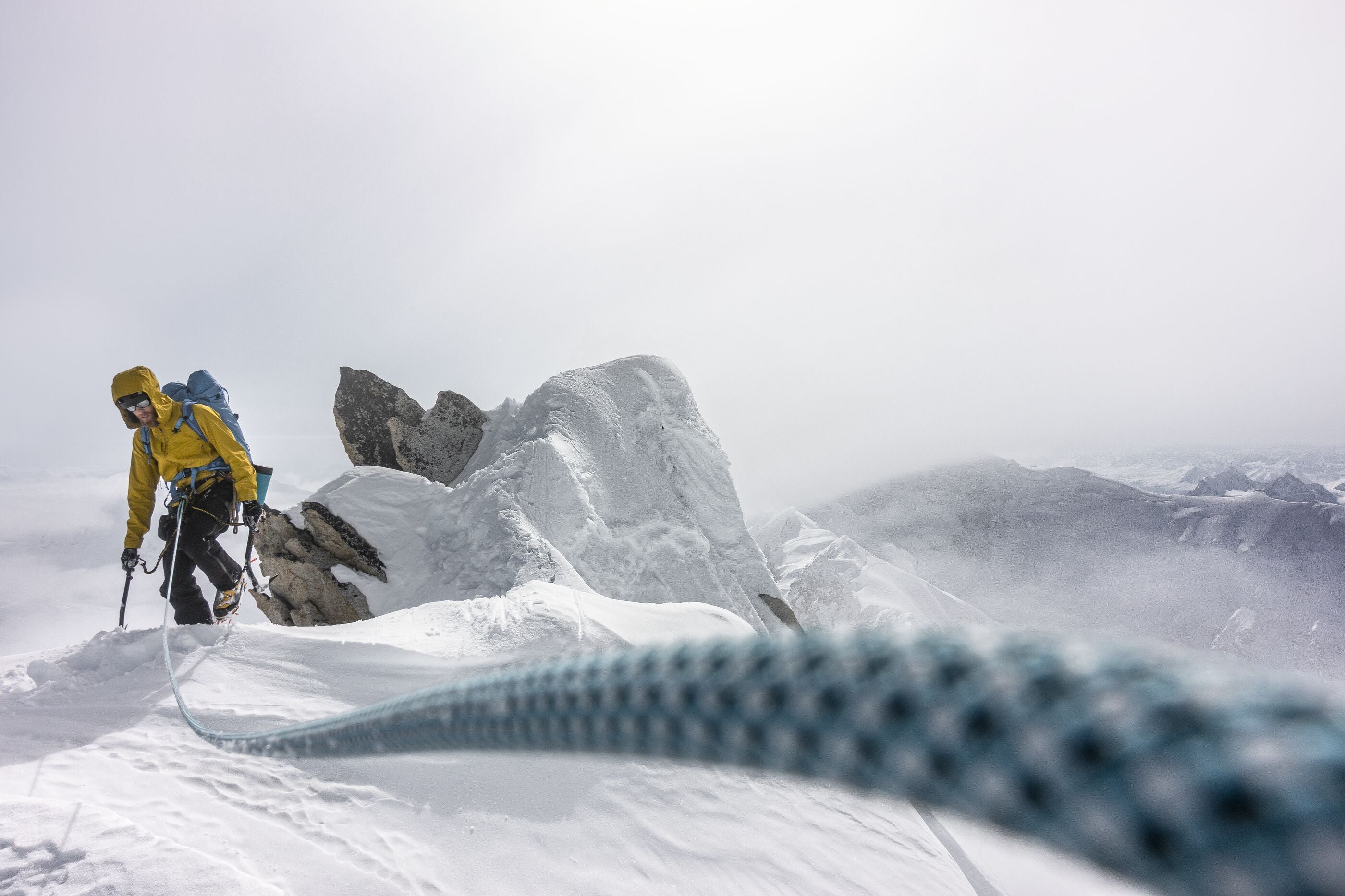 Then we have our insulated midlayers. Within this category we have down, synthetic and active insulation. Down insulation is made from duck and goose feathers, providing an excellent warmth-to-weight ratio. Down is highly compressible and lightweight, making it a great choice for cold, dry conditions when weight and space are at a premium. Synthetic insulation is the alternative to down and is the best midlayer for wetter conditions. It’s also lightweight and packable, but unlike down, it keeps you warm even when wet. Our final option is active insulation. These layers have some stretch and exceptional breathability, and they can help moderate your temperature as you move. Active insulation, led by our Nano-Air®️ products, has become the go-to midlayer for mountain athletes during high-output activities in cold weather.