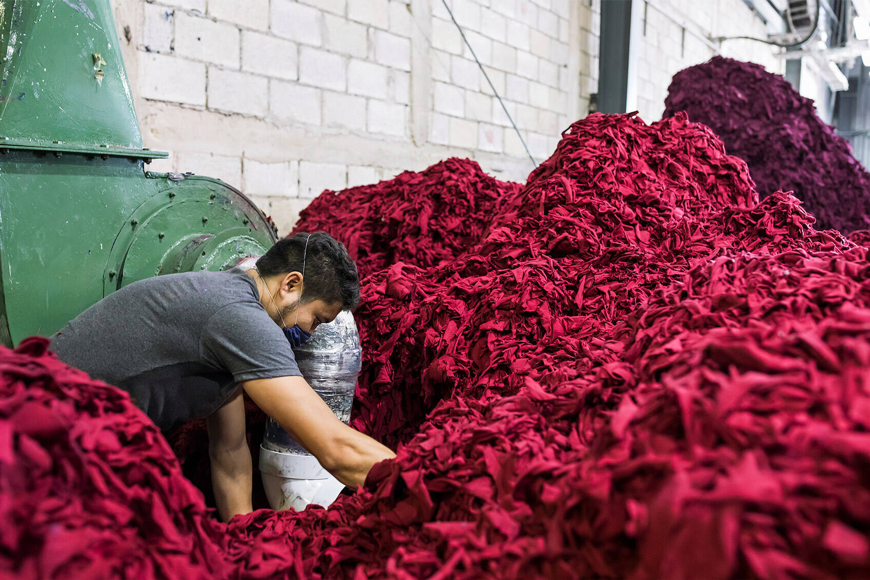 Patagonia's supply-chain partners collect pre-consumer scraps from our sewing factories and use only the cotton that meets our quality standards. Then, the fibers are mechanically shredded, so they can be re-spun into new yarn. Most of our recycled cotton is blended with recycled polyester. This process extends the length of the fibers to make the perfect yarn for sweatshirts and T-shirts.